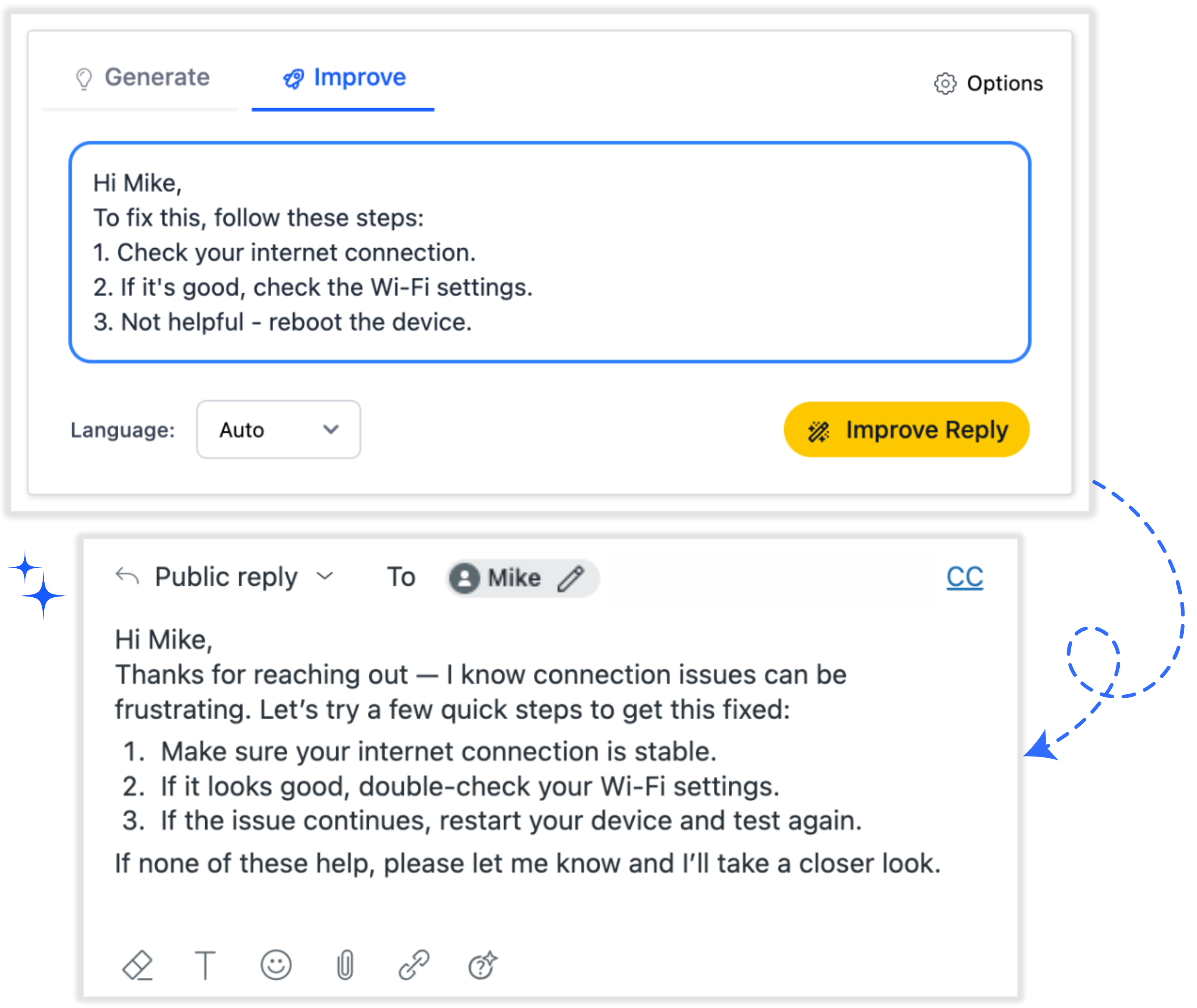 Faster replies - reduces the time to craft replies from minutes to seconds.